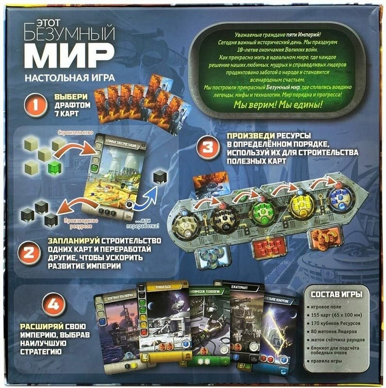 Настольная игра «Этот безумный мир» – это экономическая стратегия в сеттинге романа Олдоса Хаксли «О дивный новый мир», ставшим классикой по всему миру. В ней участникам нужно совершать открытия, затрачивая на них различные ресурсы. Рассчитана она на компанию от 1 до 5 человек старше 12 лет.
