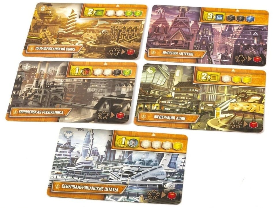 Как только здание будет построено оно переходит в верхнюю часть планшета игрока и начинает давать полезные баффы и ресурсы. В конце игры участники подсчитывают победные очки за построенные здания, и, набравший больше всего, побеждает.