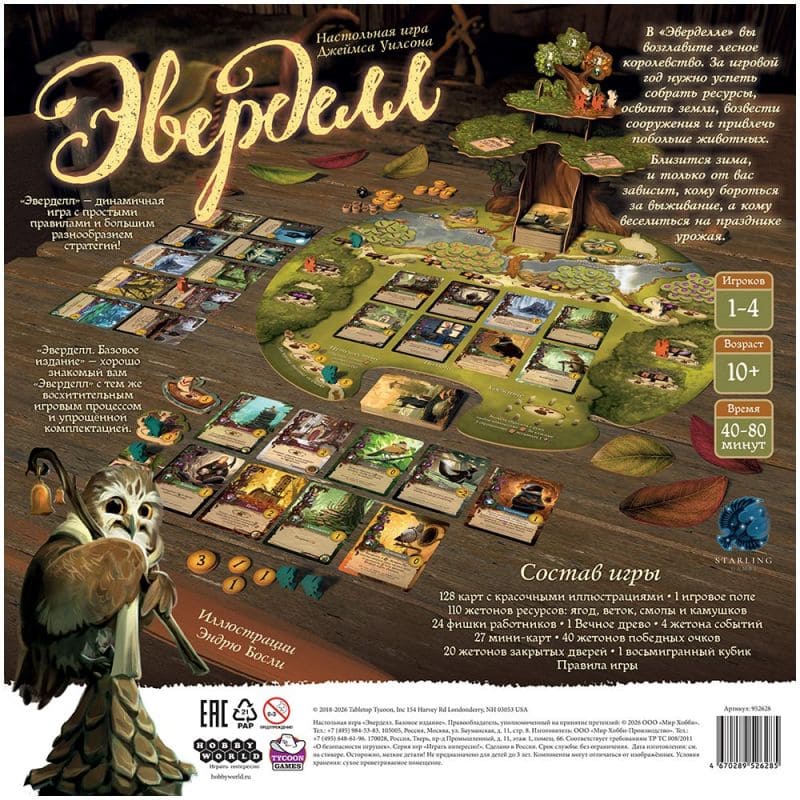 «Эверделл» - это полная тепла и уюта настольная игра для 1 – 4 игроков в возрасте от 13 лет. Необычное игровое поле, во главе которого стоит настоящее дерево, и другие компоненты очаровывают своим дизайном, использующем приятные мягкие цвета. Вместе с тем, несмотря на всю мимишность игры, «Эверделл» - это стратегия на размещения рабочих, каждому из которых известно, что зима не за горами.