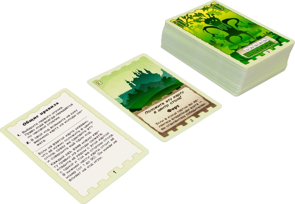 - на этой карте приведены правила, изображены часы или форт, он кладет их в открытую на стол, и берет еще одну карту;