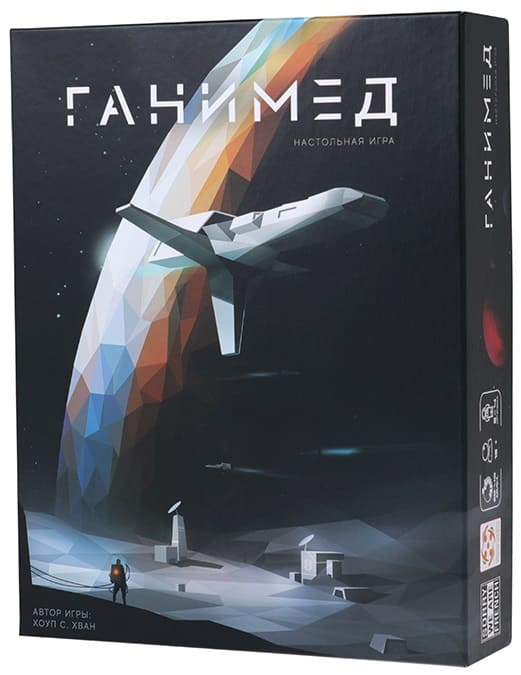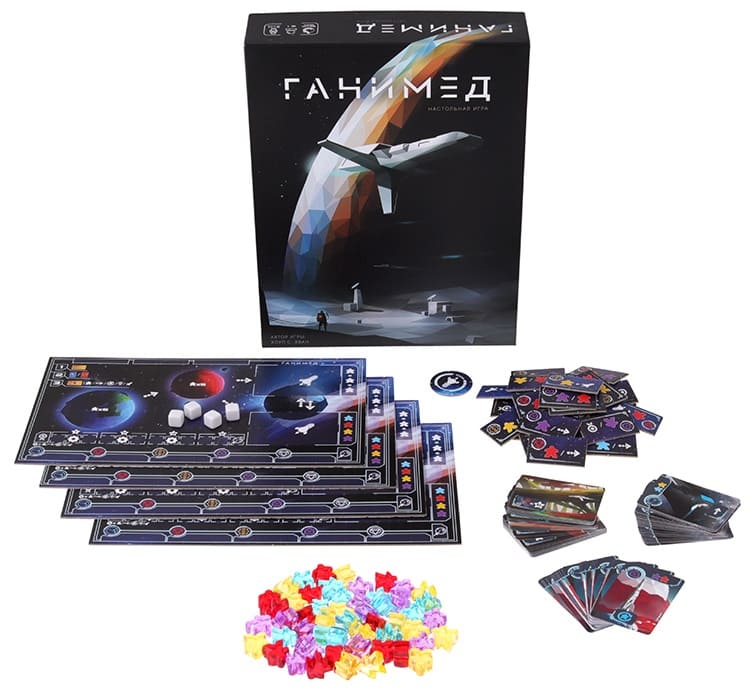 «Ганимед» - быстрая стратегическая настольная игра космической тематики, продолжительность партий которой не превышают 40 минут. В игре использована необычная механика взаимодействия карт, а красоты игре добавляют акриловые миплы космонавтов.