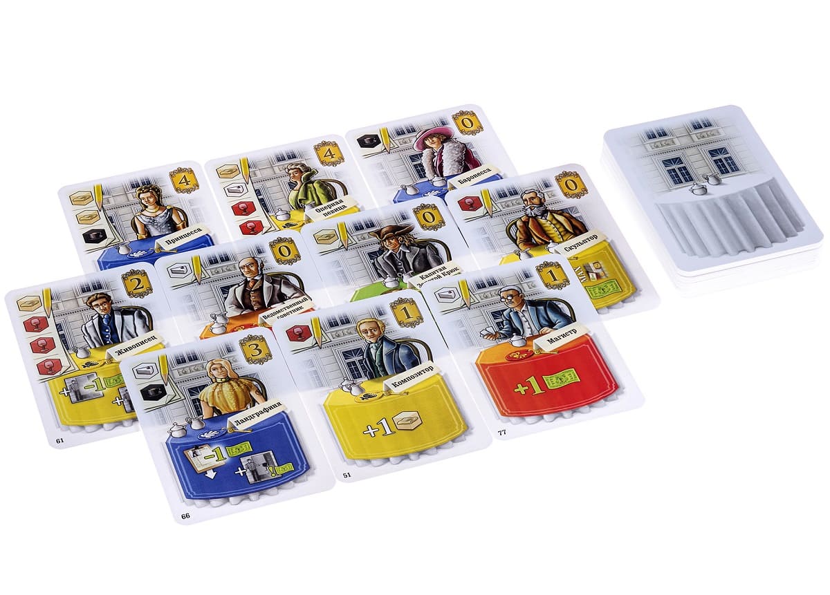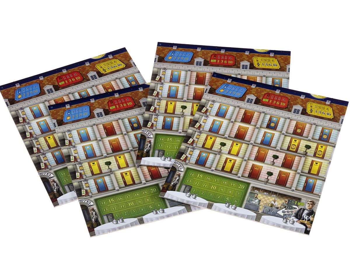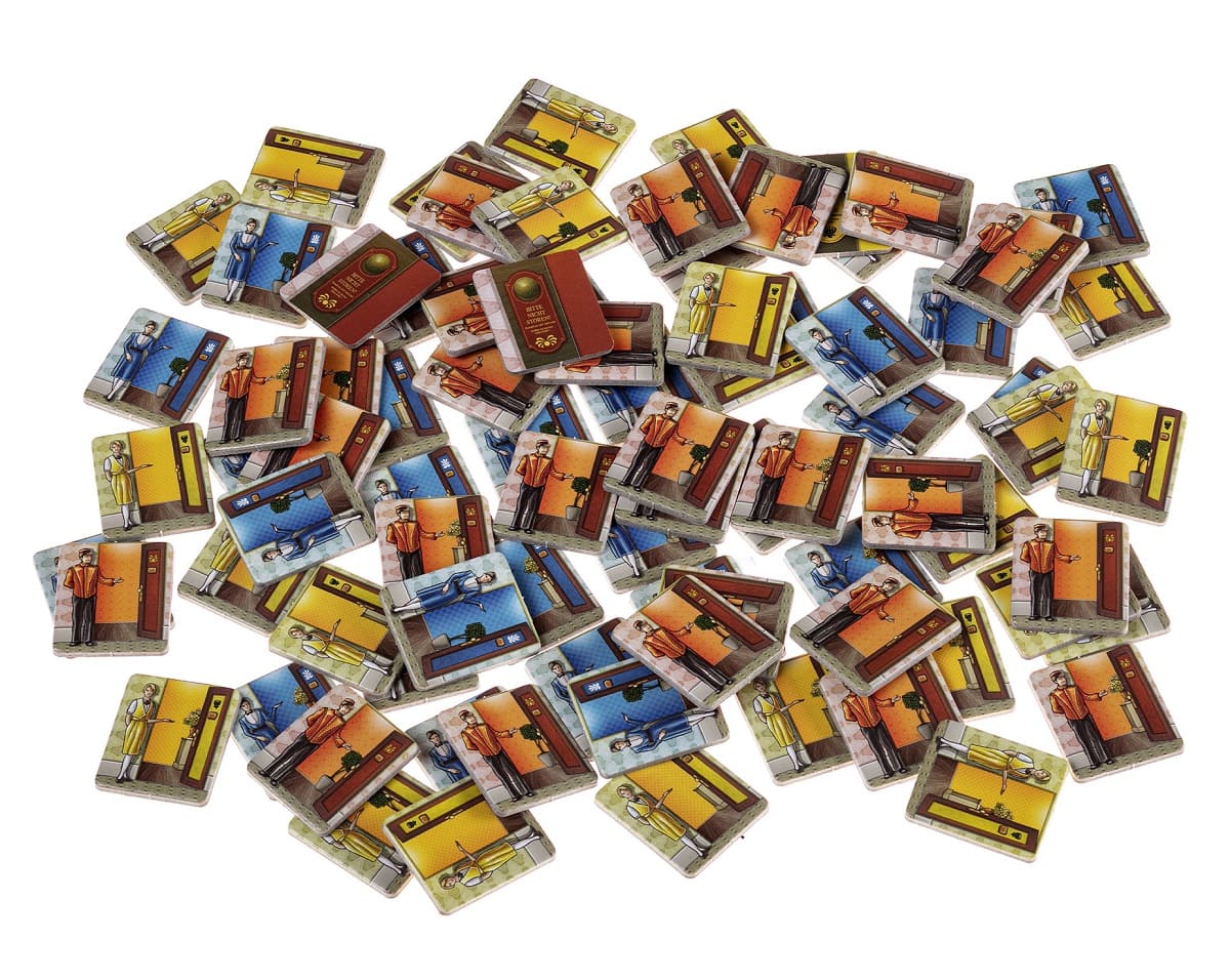 - 120 карт (56 карт постояльцев, 48 карт персонала, 12 карт целей, 4 памятки);