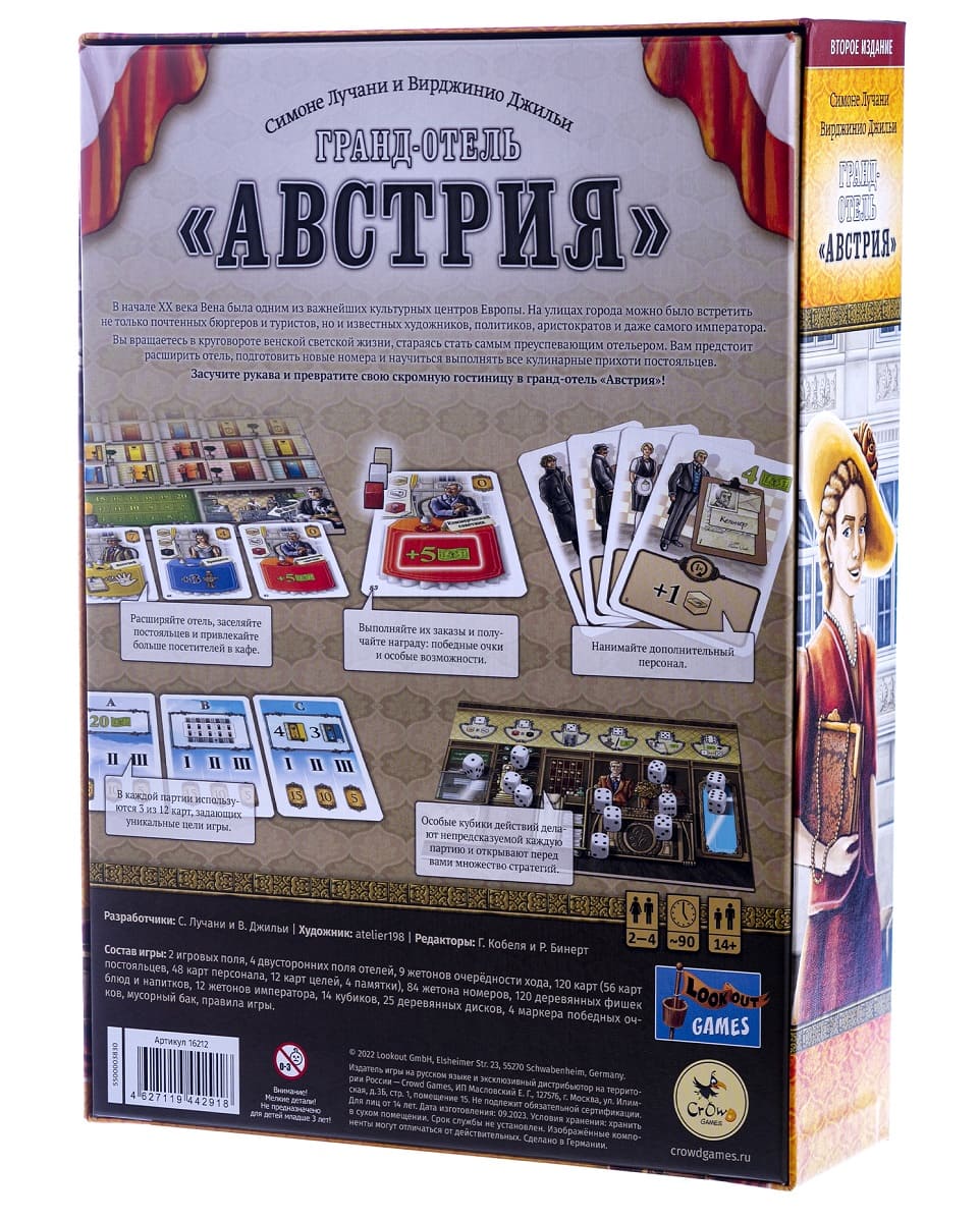 «Гранд-отель «Австрия» – стратегическая настольная игра с драфтом кубиков, в которой участникам предстоит взять под управление небольшую гостиницу в австрийской столице начала XX века и добиться ее процветания. Конкурируя за сердца обеспеченных постояльцев и высоких особ, Вы будете управлять всеми аспектами работы заведения: организацией качественного питания, предоставлением комфортабельных условий проживания и привлечением выгодных клиентов.