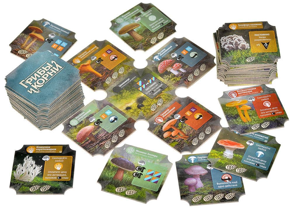 «Грибы и корни» – стратегическая настольная игра, в которой игрокам предстоит управлять процессом симбиоза между молодыми деревьями и грибами. Автором игры является Элизабет Харгрейв, чьими мировыми хитами являются «Крылья» и «Эксперимент. Домашние лисы». Она проста в освоении, но богата интересными решениями и тактическими возможностями. Игроки погружаются в атмосферу живого леса, где хвойные деревья растут рядом с грибами, формируя гармоничную систему взаимодействия.