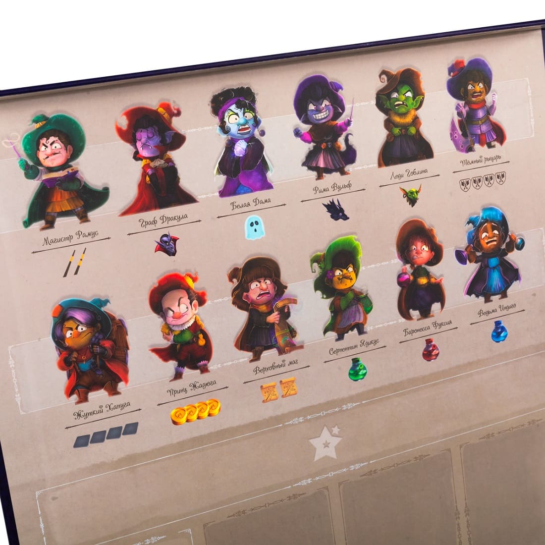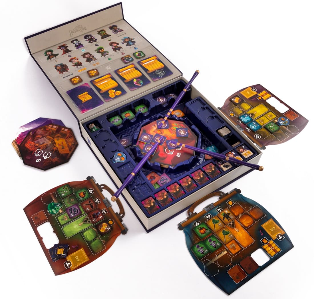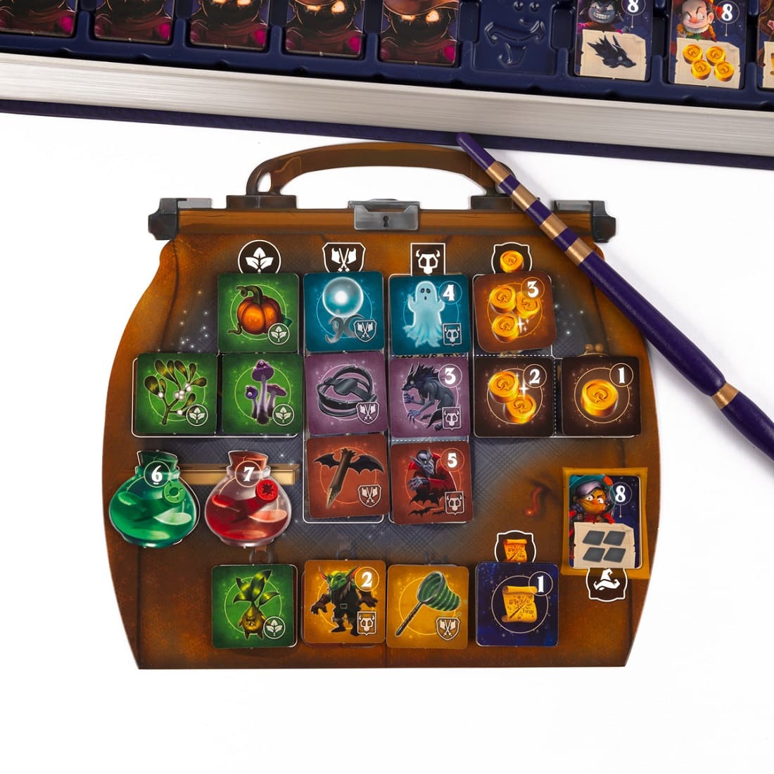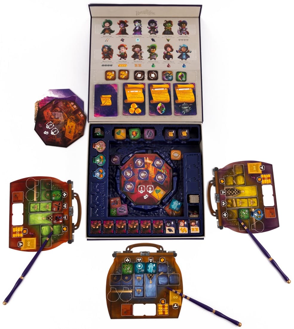 Когда маги добираются до дна коробки-башни, начинаются битвы с колдунами. Чтобы победить злодея, нужно потратить ресурсы, соответствующие его слабостям (например, синее зелье или жетоны монстров).