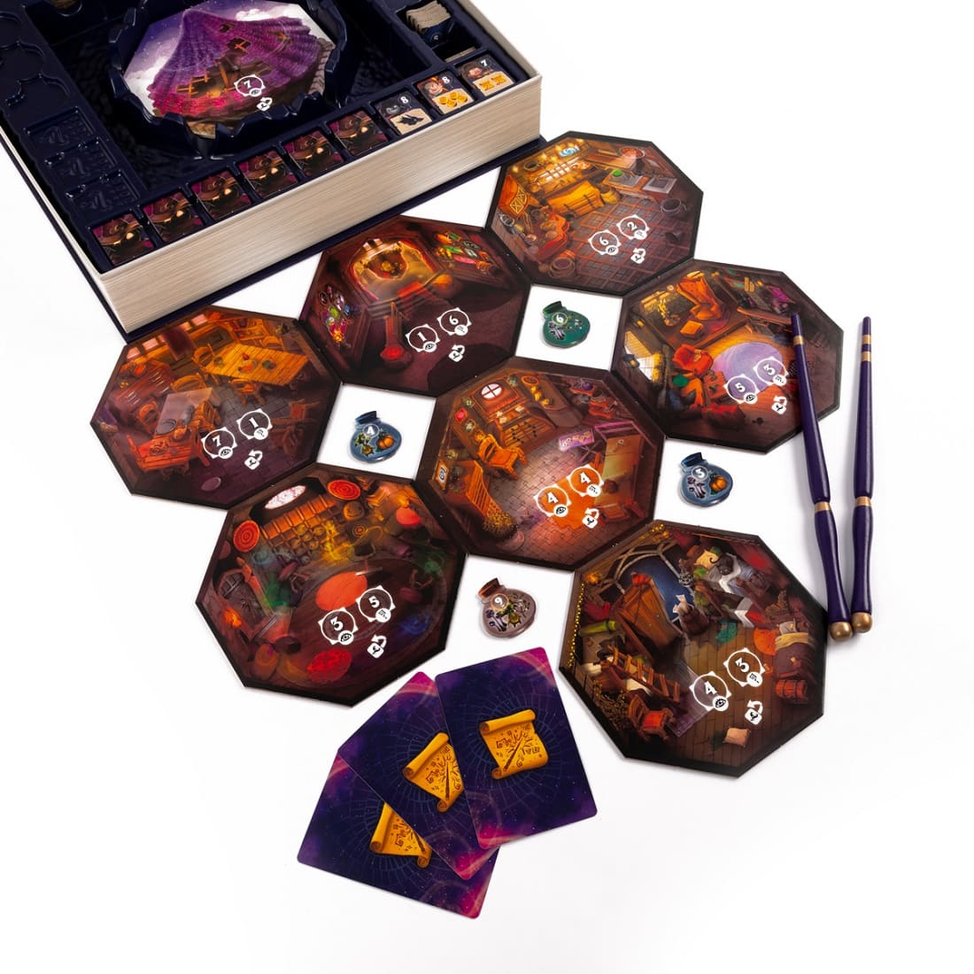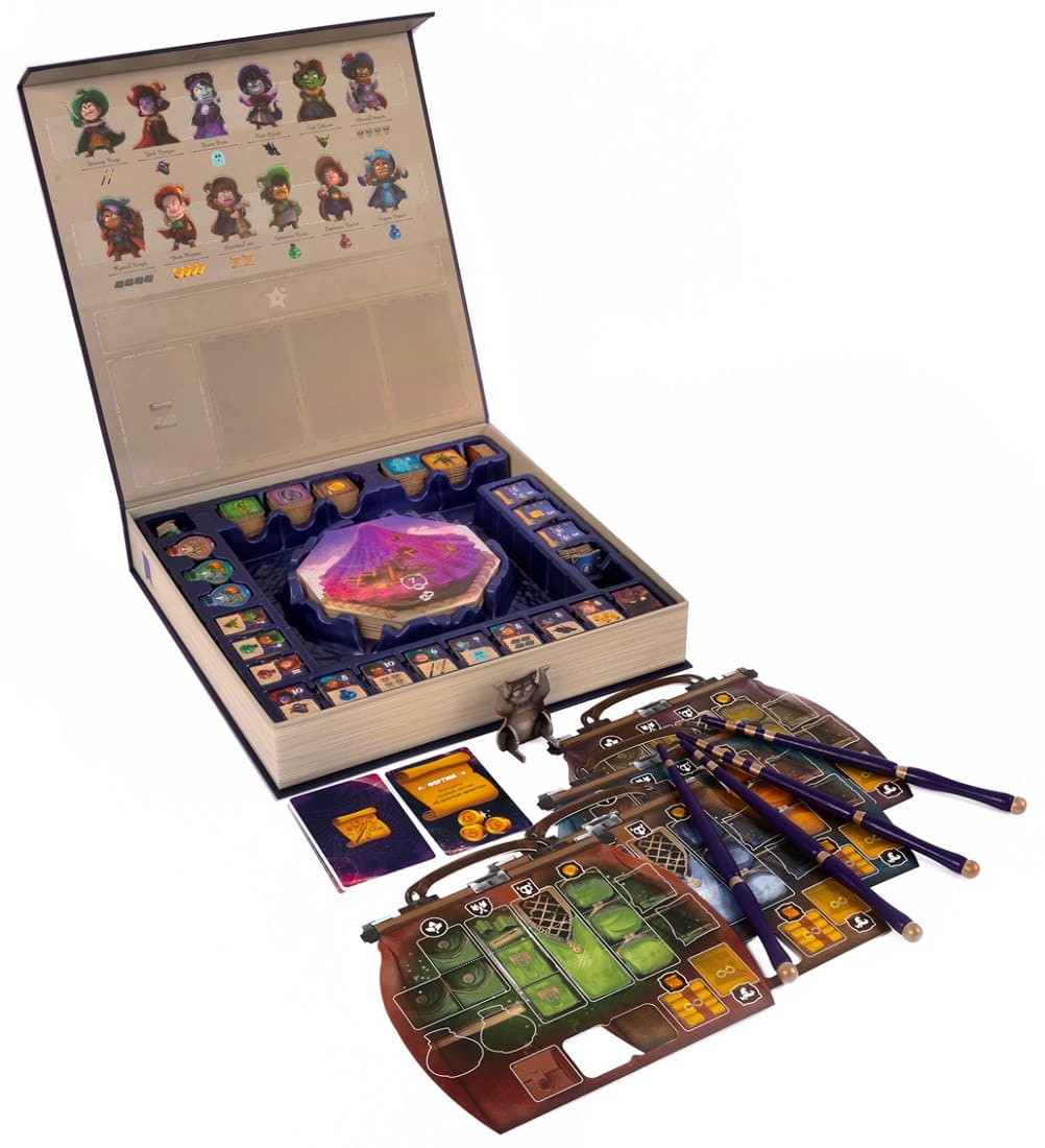 При подготовке к игре участники раскрывают коробку, выполненную в виде магического фолианта, и которая является частью игрового поля. Она устанавливается на специальную подставку, а внутрь помещается стопка тайлов комнат.