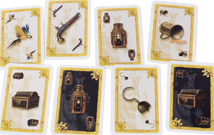 1. Сыграть карту с руки и передвинуть одного пирата вперед. В этом случае одна из карт с символом отправляется в сброс, а одна из фишек пиратов перемещается на ближайшую впереди нее свободную ячейку с тем же символом что и на карте. Если все символы заняты – фишка отправляется прямиком в шлюпку. Перемещаться может любой из 6 пиратов, независимо от их местонахождения.