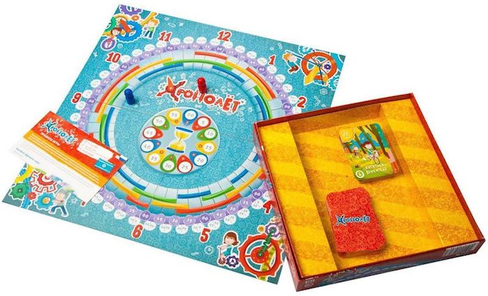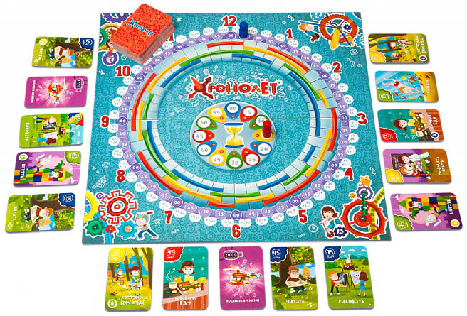 По своей сути настольная игра «Хронолет» - это ходилка, в которой игровое поле имеет форму круга – циферблата часов, а за перемещение фишки игрока отвечают карты с делами, на которых отмечено время на их выполнение. Важный момент – поле и карты имеют цветовые отметки, которые обозначают может ли в текущее игровое время быть разыграна та или иная карта. Так если фишка игрока стоит на ячейке рядом с которой идет красная линия, то игрок может разыграть карту с красной отметкой, но по продолжительности не более чем время до которого доходит красная линия.