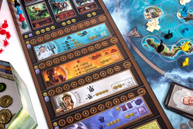 Ни одно из событий в игре не происходит без воли четырех богов: Зевса, Афины, Посейдона и Ареса. Получить благословение обитателей Олимпа можно поднося им богатые подношения, которые в «Киклады (Cyclades)» происходит по принципу аукциона – если ставка игрока сделанная на одного из богов перебита другим, то ему придется давать подношения иному богу. Каждый бог благотворит в своей области: