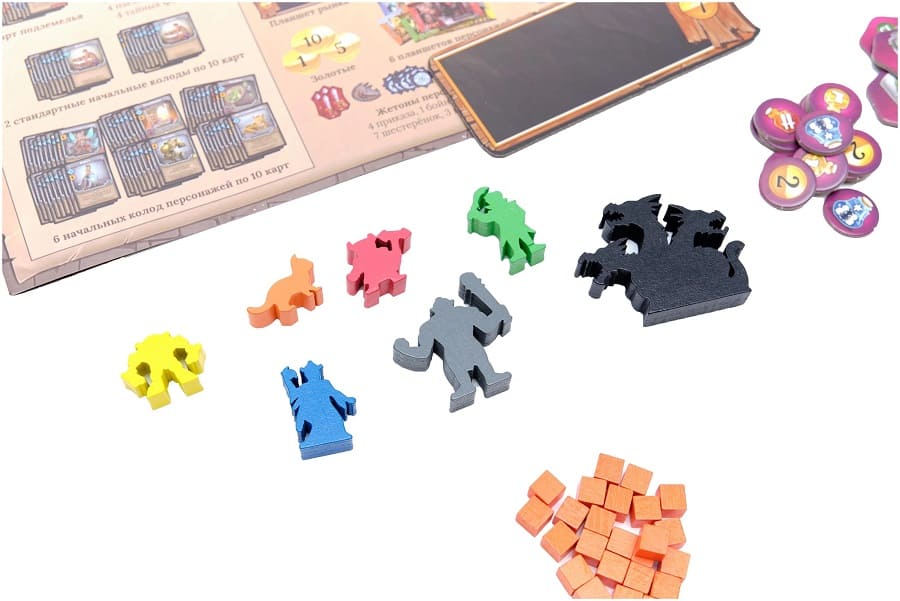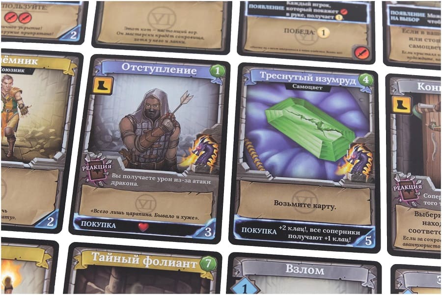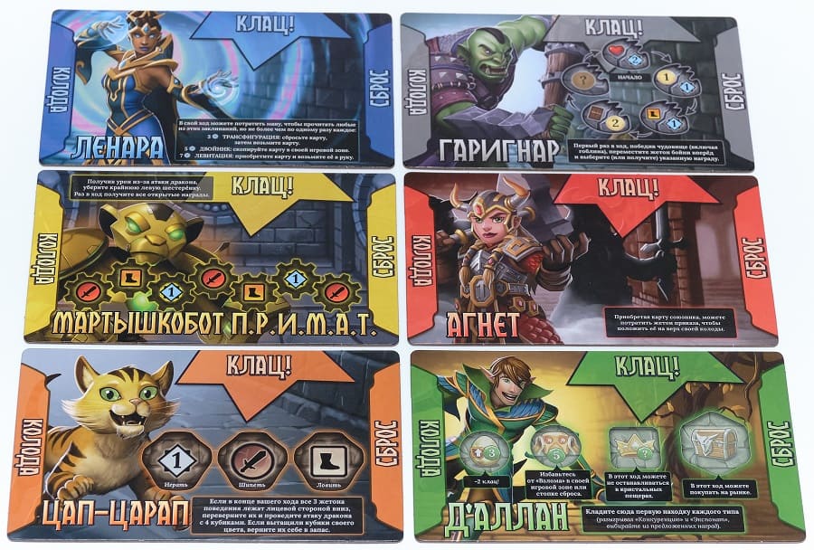 - шесть игровых персонажей с уникальными стартовыми колодами и планшетами, позволяющие использовать различные стратегии при спуске в пещеру за сокровищами.