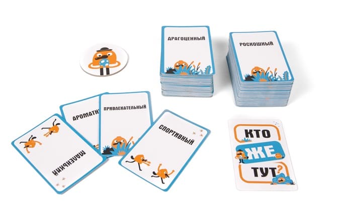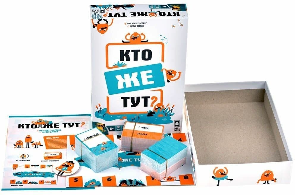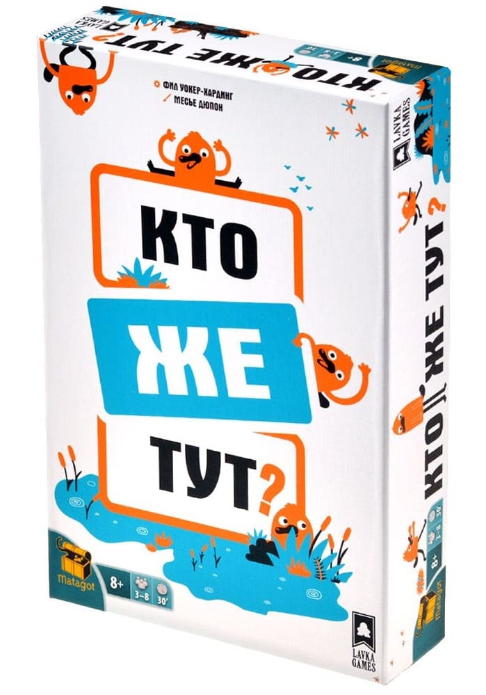 «Кто же тут?» – это веселая кооперативная настольная игра для большой компании, в которой два игрока должны отгадать загаданное слово, а остальные должны помогать им в этом. Рассчитана она на компанию от 3 до 8 человек возрастом старше 8 лет.