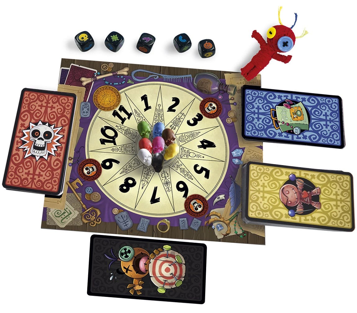 Разместите игровое поле с очками в центре стола. Затем разделите карты на три стопки: жёлтые («Заклинания»), красные («Вечные Проклятия») и синие («Фокусы»). Перетасуйте каждую стопку отдельно и разложите на поле. Все игроки получают по одной карте заклинания и выбирают цвет своей фишки. Ход начинается с броска пяти игровых кубиков. Доступные действия определяются комбинациями символов, выпавших на их на гранях. Если комбинации совпадают с необходимыми ингредиентами заклинания, вы можете активировать магическое воздействие на соперника. Карта заклинания принесет вам определённое количество очков, указанное в её левом верхнем углу. Помимо этого, некоторые специальные эффекты проклятий также способны приносить дополнительные баллы.