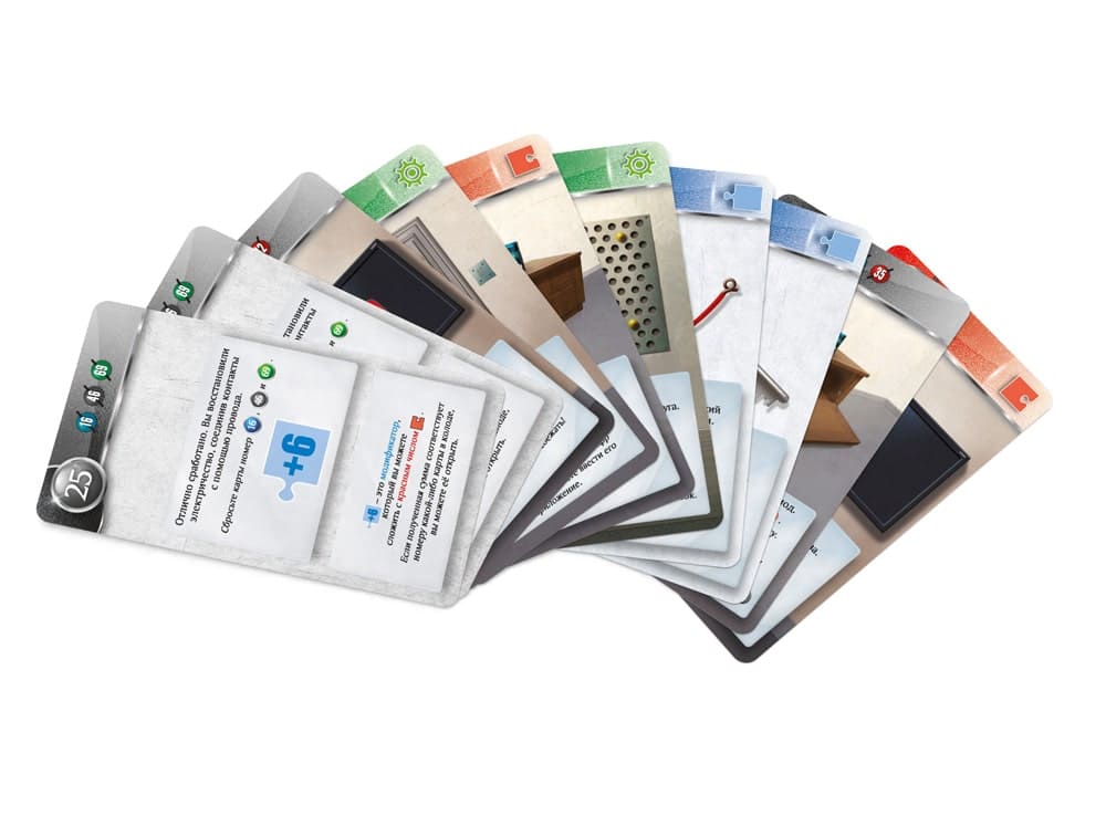 - 3 приключения (180 карт, 1 карантинная карта, 6 красных кубиков и 1 буклет с решениями),