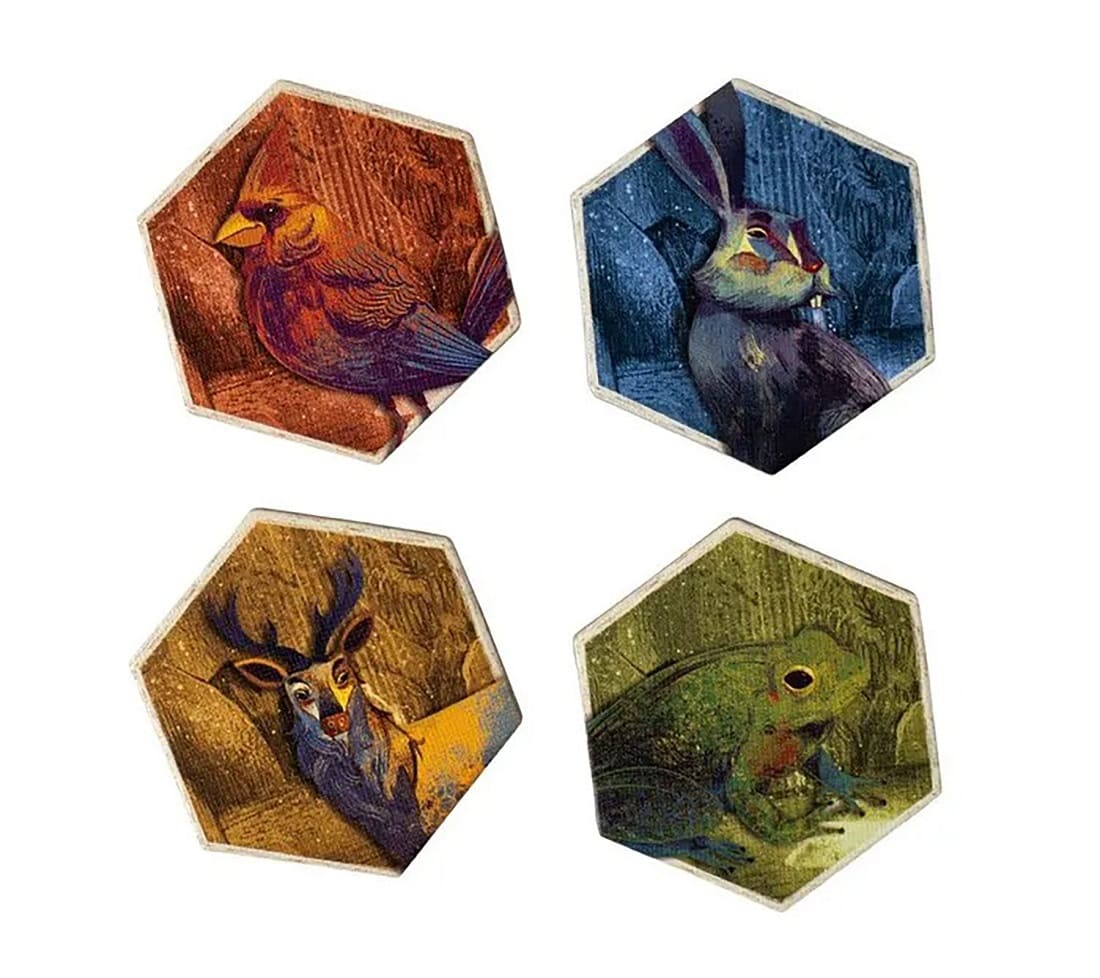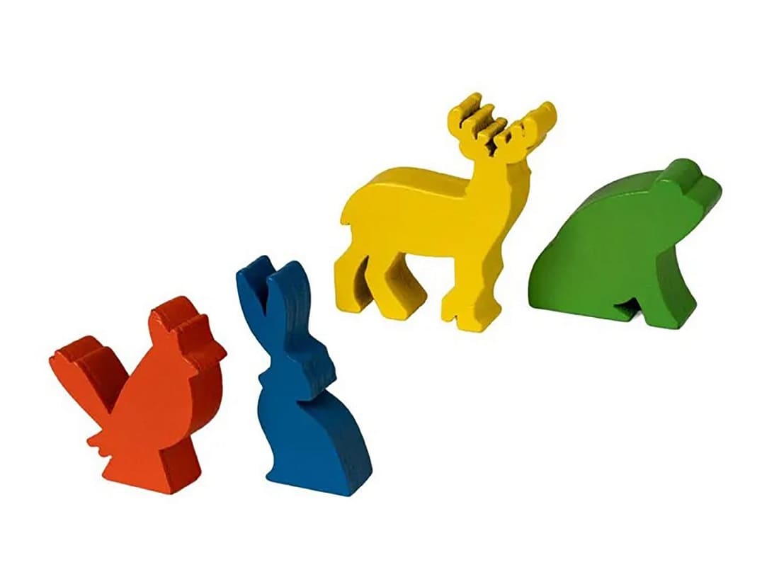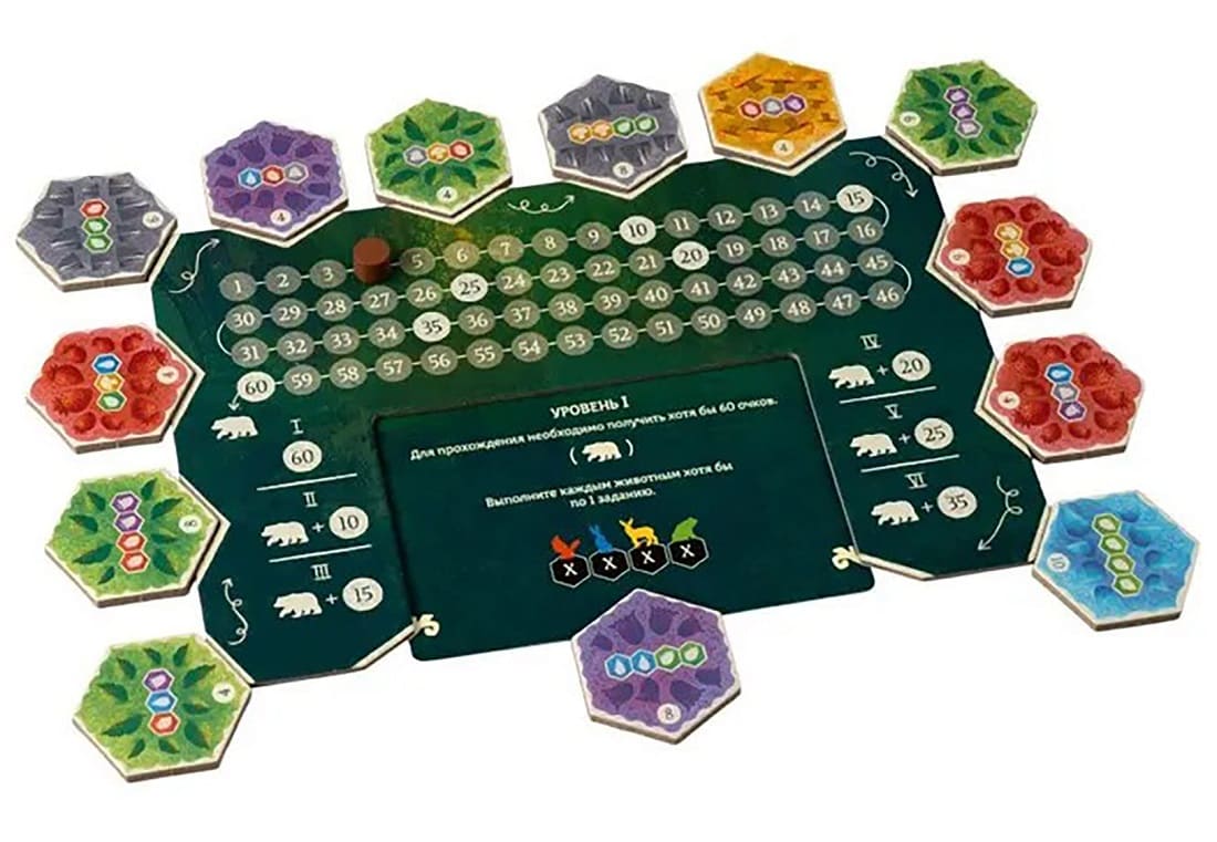 - Двусторонние тайлы: Ключевая особенность игры. Каждый тайл — это одновременно и фрагмент леса, по которому перемещаются животные, и карточка задания с обратной стороны.