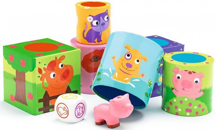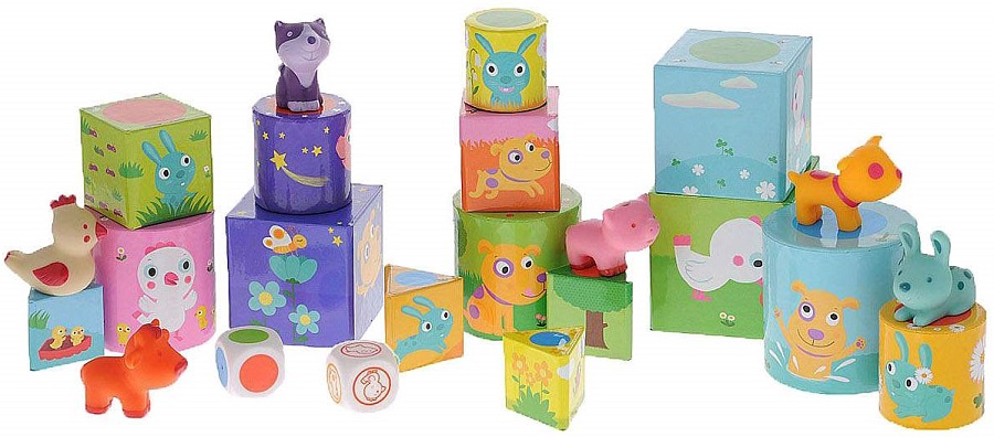 Возможны три варианта игры: "Прогулка животных", "Прятки", "Тарарах у животных". Малыш будет прятать фигурки животных под коробочками или ставить их сверху, строить пирамидки и свое игровое поле и многое другое.