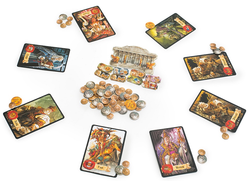Основным компонентом игры являются карты с изображенными на них персонажами. Каждый персонаж обладает определенными возможностями, и дает игроку выполнить указанное на нем действие. Например, Королева может получить 2 монеты из банка, Судья – получить деньги с суда, Вор может стырить 1 монету у соседа и т.д. Но главное, суметь их разыграть.