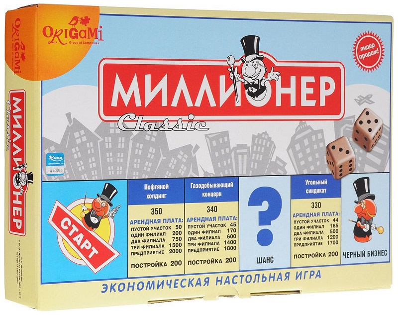 Настольная игра «Миллионер» - это самый знаменитый отечественный аналог игры «Монополия» по весьма привлекательным ценам. Цель и механика игр идентичны – захватить как можно больше участков на игровом поле, превратив свои империю в монополию, и разорить конкурентов – участников игры.