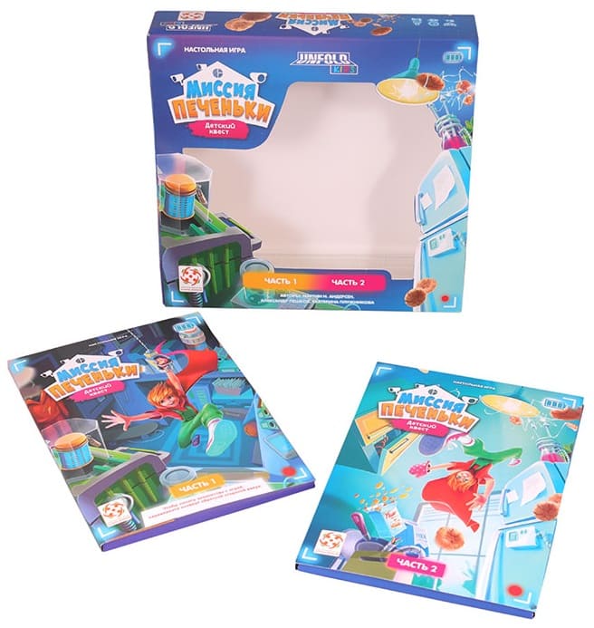 «Миссия Печеньки» - это детский настольный квест в формате UNFOLD предназначенный 1 – 4 участников в возрасте от 8 лет. Уникальность данного формата состоит в том, что сам квест представляет собой закрытый конверт, множество створок которого раскрываются по мере прохождения сценария и разгадке головоломок. Таким образом история квеста в прямом смысле разворачивается перед игроками.