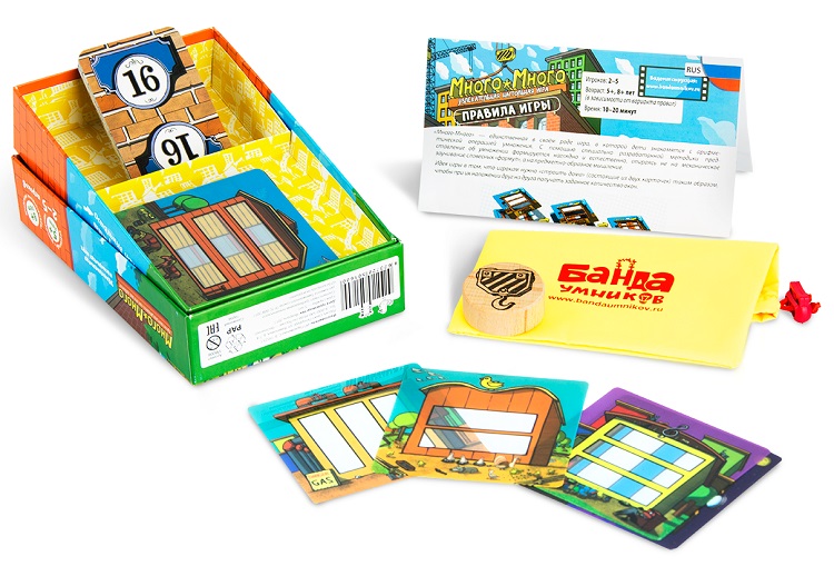 Свою идею авторы игры нашли. смотря на многоэтажные дома. Сколько окон в доме? Правильно, количество этажей, умноженное на количество окон на одном этаже. Игра «Много-много» демонстрирует это действие путем наложения двух карточек с прозрачными окнами друг на друга. Таким образом игроку предстоит «построить» дома с нужным количеством окон подобрав 2 подходящие карточки.