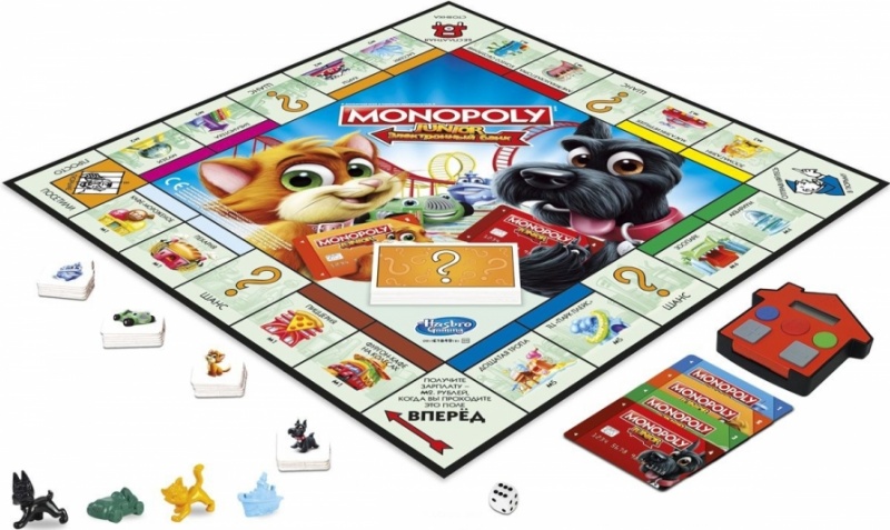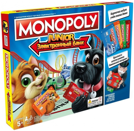 Монополия Джуниор с картами – это детский вариант самой известной экономической настольной игры в мире. В ней все как у взрослой версии, и даже расчеты между игроками происходят с помощью банковских карт. И цель игры такая же - заставить обанкротиться своих соперников, покупая территорию и беря за неё плату.