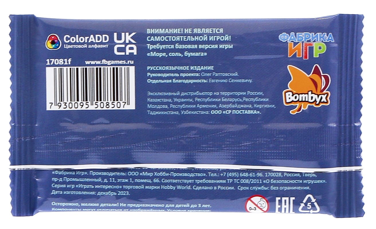 «Больше соли» - дополнение к настольной игре «Море, соль, бумага». Оно содержит новые карты с уникальными эффектами. Каждая карта дополнения имеет специальную отметку, с помощью которой их легко отличить от карт основной колоды.