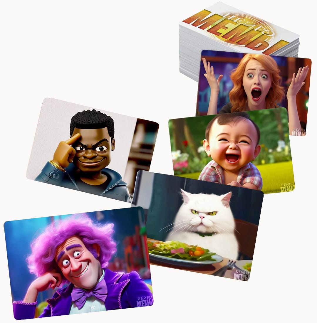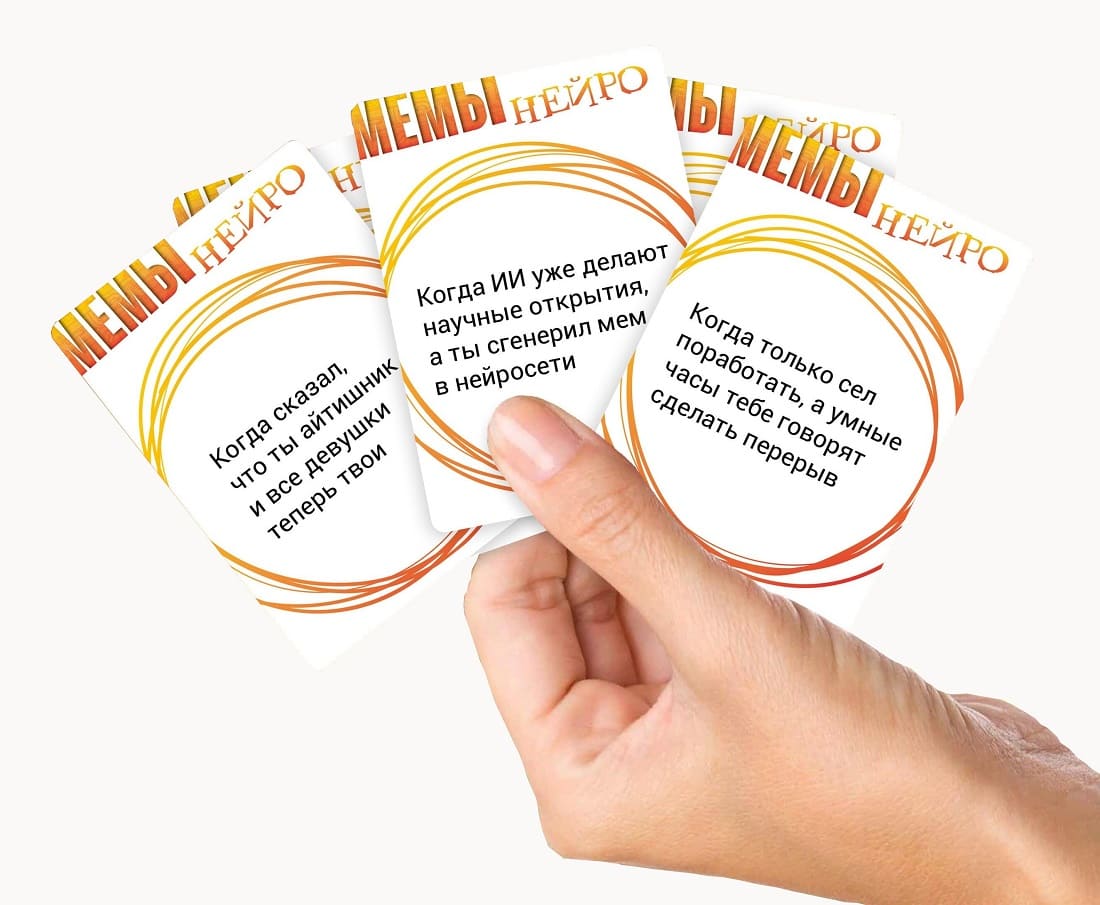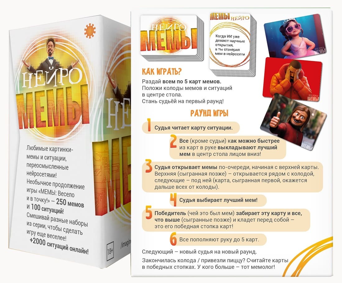 «Нейро МЕМЫ» - четвертая игра из серии «Мемы» от издательства «Экономикус»,над созданием которой оно трудилось вместе с нейросетями. В ее составе 250 картинок-мемов, созданных искусственным интеллектом и 100 карт с ситуациями, затрагивающих тему ИИ.
