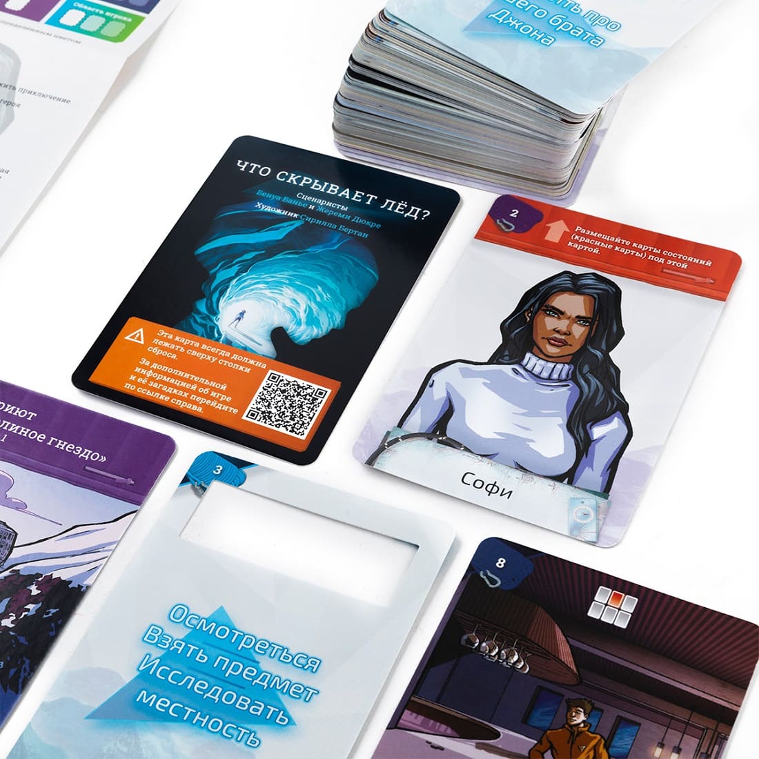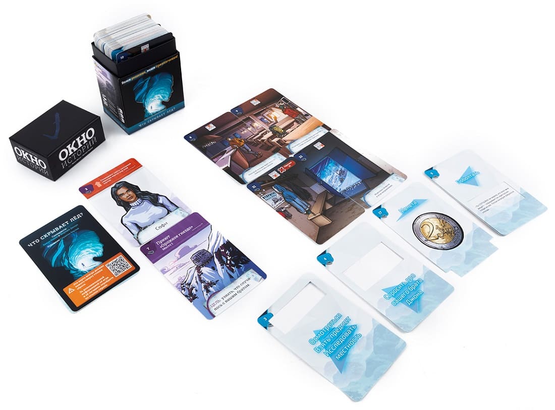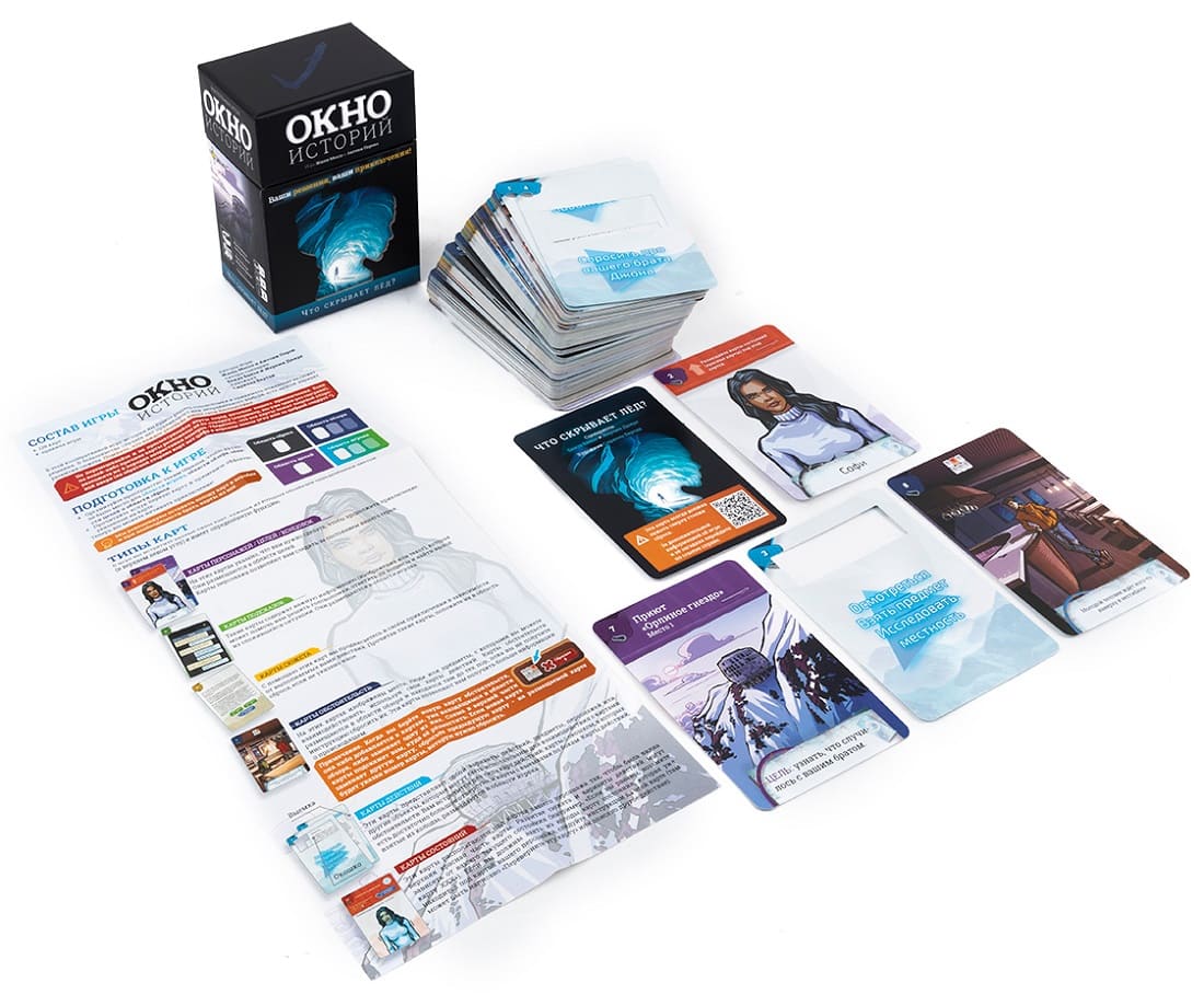 «Окно историй. Что скрывает лёд?» —сюжетная настольная игра из серии «Окно историй». В ней участникам предстоит примерить на себя роль молодой девушки Софи, которая отправилась на поиски своего брата на Монблан. В этом полного множества приключений путешествии вам предстоит принять множество решений, каждое из которых будет влиять на дальнейшие события и финал.