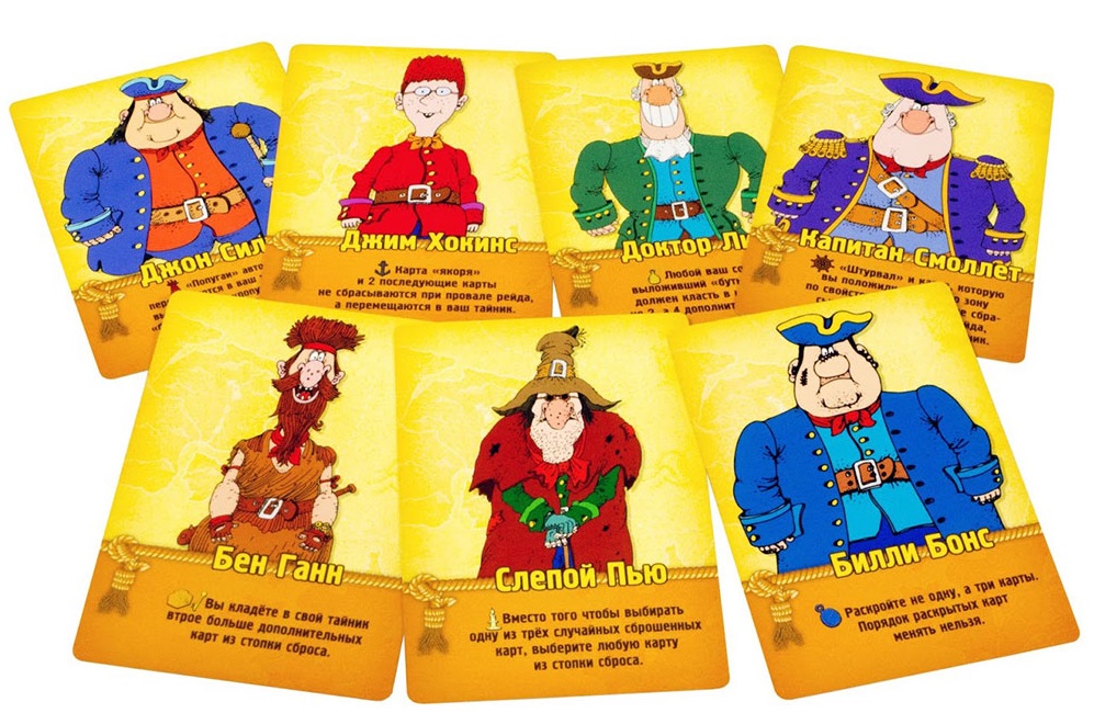 После того, как правила и свойства карт трофеев станут привычными, в игру можно ввести карты Персонажей, которые также вносят свои «изюминки» в игру. А еще правила «Острова сокровищ» позволяют увеличить количество участников игры, смешав в единую стопку два игровых набора.