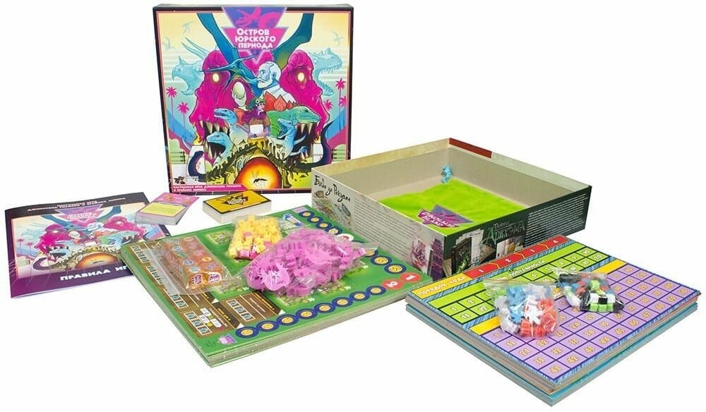Настольная игра «Остров юрского периода» – это экономическая стратегия, в которой игрокам предстоит создать свой остров с динозаврами: строить аттракционы, нанимать различный персонал, который будет следить за всем, в том числе и за безопасностью, а также выводить новые породы динозавров, смешивая их ДНК. Рассчитана она на компанию от 1 до 4 человек возрастом старше 8 лет.