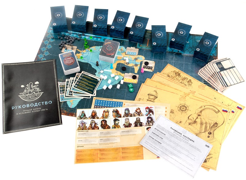 - 53 карты игрока (36 карт городов, 5 карт эпидемий, 4 карты планируемых событий, 8 карт производства снабжения);