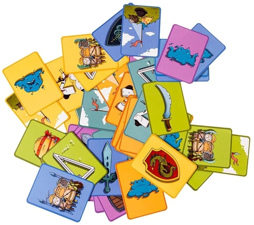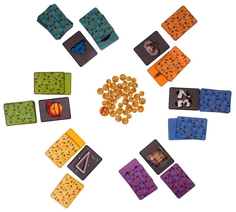 - 6 наборов карт шести цветов (по 6 персонажей и по 1 холму, щиту и мечу каждого цвета);