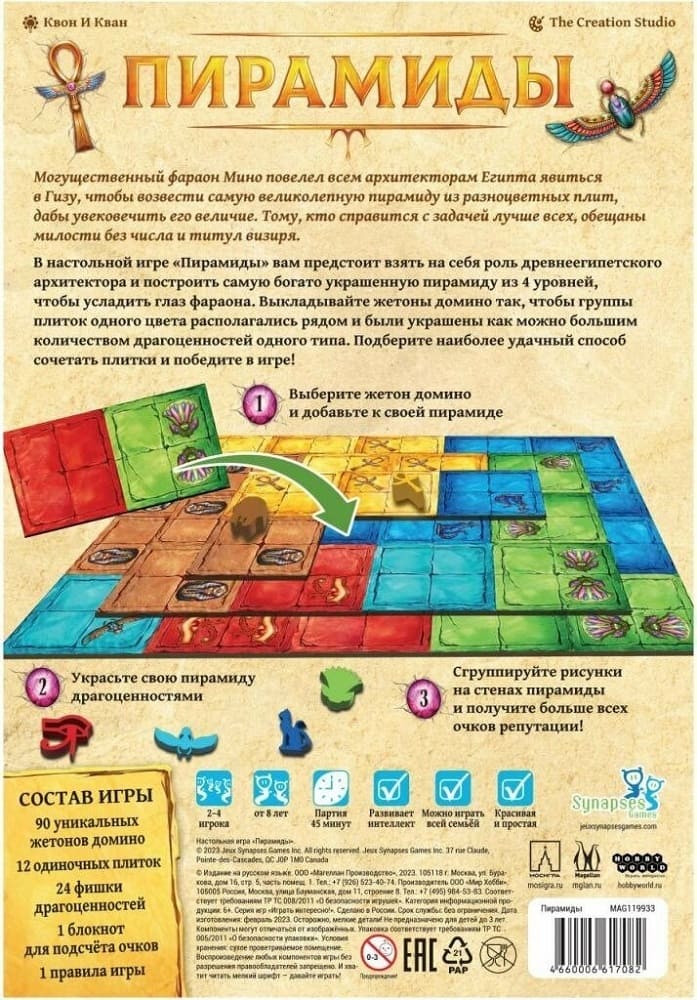 В настольной игре «Пирамиды» участникам предстоит из стилизованных жетонов домино собирать четырехуровневые пирамиды. А победителем игры окажется тот, чья пирамида окажется наиболее украшена драгоценностями и больше других усладит взгляд фараона.