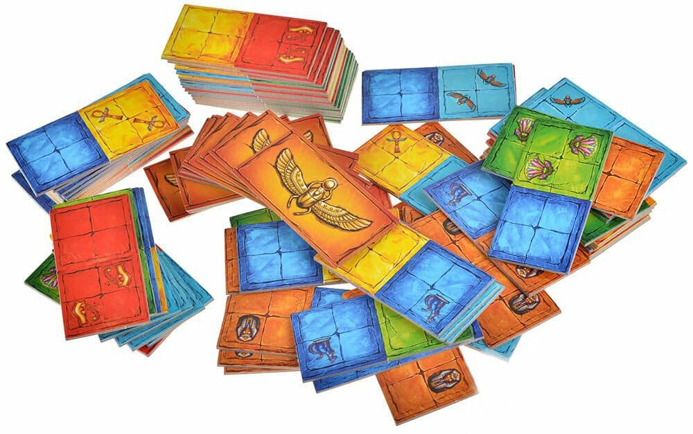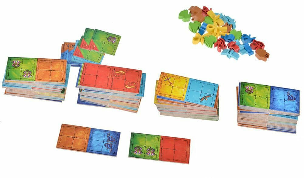 Каждый жетон состоит из 2 плиток-квадратов разных цветов и с изображением 2 символов драгоценности, каждому цвету соответствует своя драгоценность.