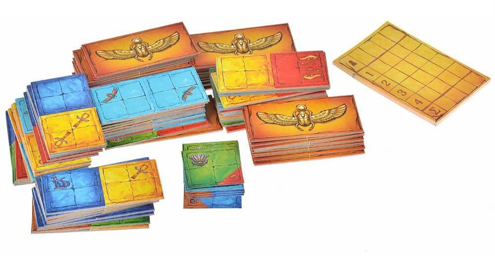 Игра «Пирамиды» состоит из 4-х раундов, в каждом из которых возводится один уровень пирамиды: первый 4 х 5 плиток, второй 3 на 4, третий 2 на 3 и четвертый и 1 на 2 (одного жетона).