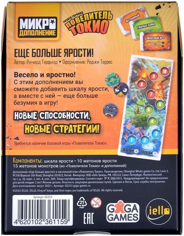 «Еще больше ярости!» - дополнение к настольной игре «Повелитель Токио», в которой огромные монстры крушат японскую столицу. С ним игроки помимо победных очков смогут накапливать и очки ярости, получая особые свойства – мощные, опасные и непредсказуемые.