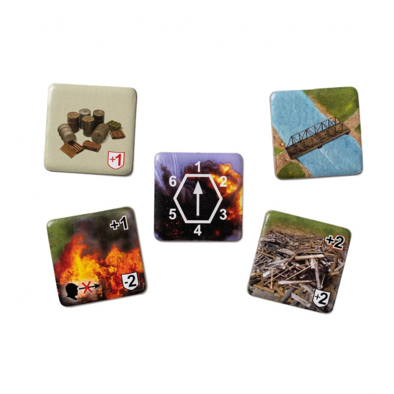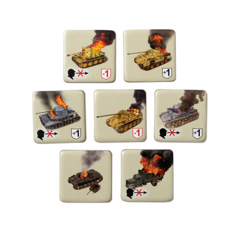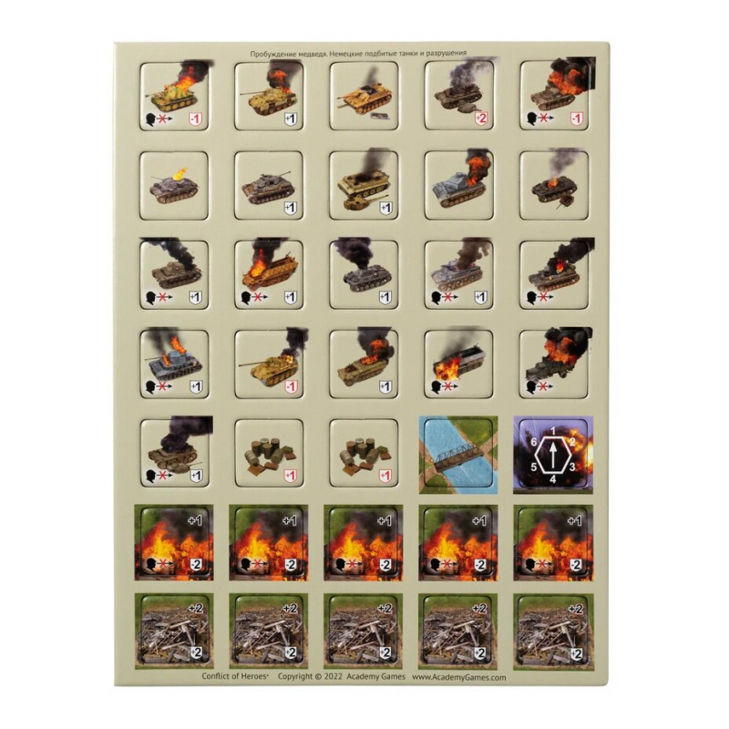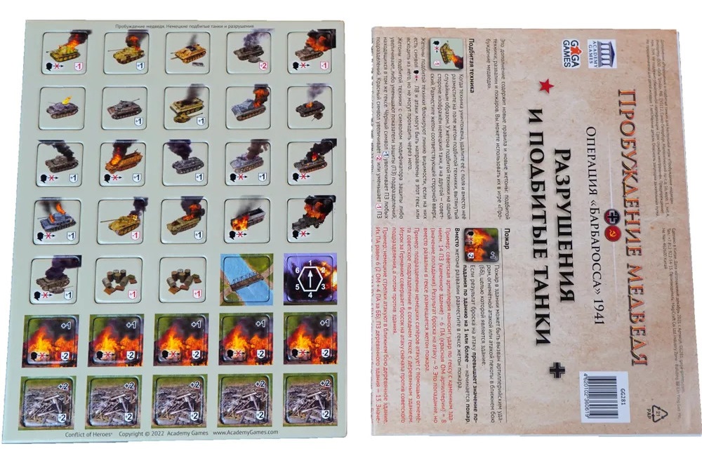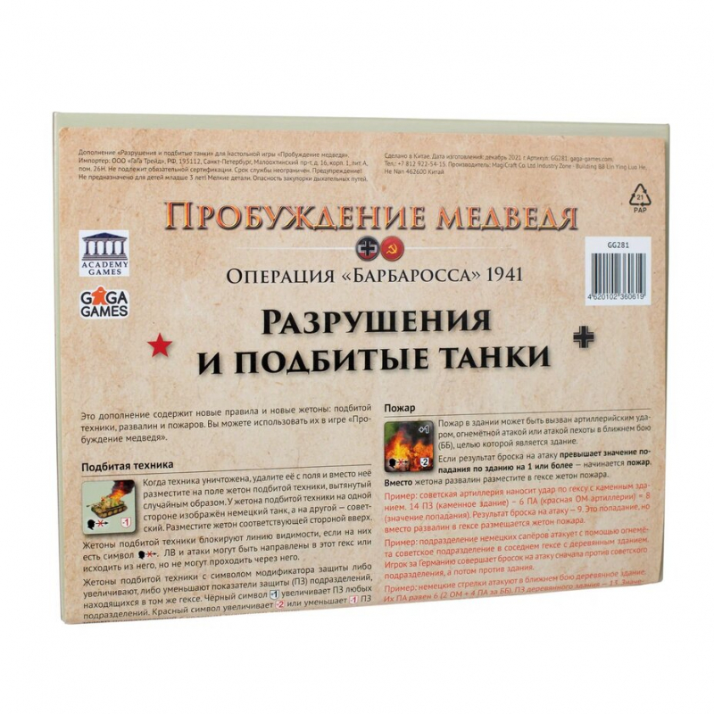 «Разрушения и подбитые танки» - дополнение к настольной игре «Пробуждение медведя», содержащее жетоны подбитой техники. При игре с этим дополнением уничтоженная в бою техника не будет исчезать с игрового поля, а перейдет в форму обломков и возгораний, которые будет ограничивать видимость и станут защитой для находящихся в том же гексе соединений.