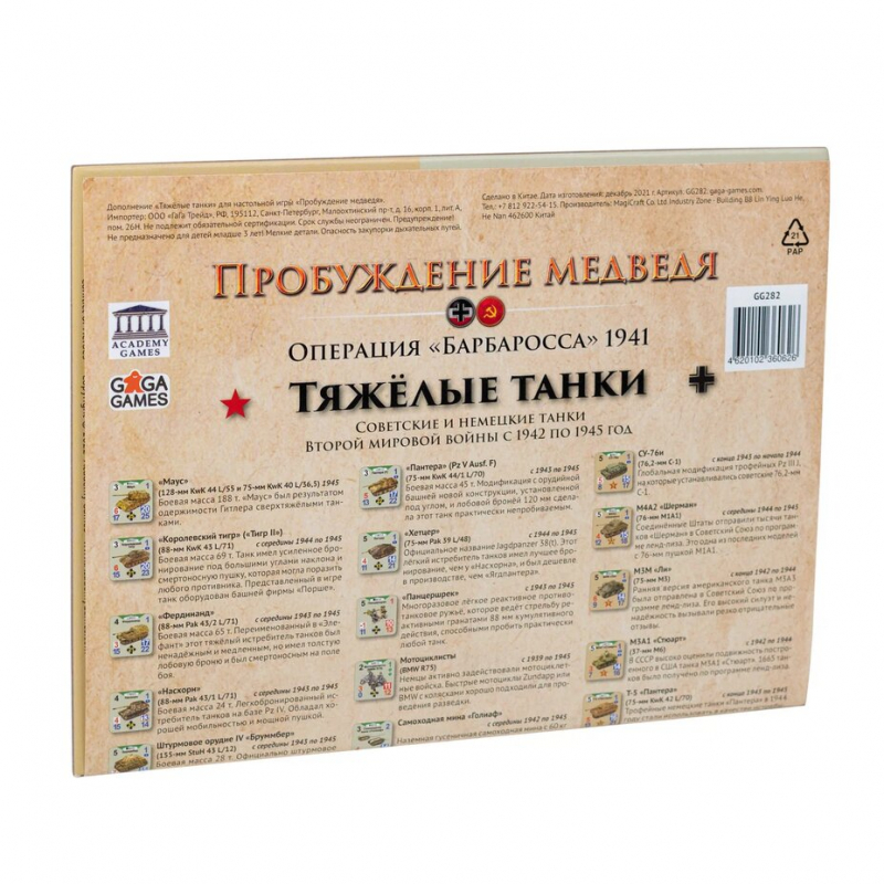 «Тяжелые танки» - дополнение к настольной игре «Пробуждение медведя», которое содержит новые фишки с техникой конца Великой Отечественной войны. Бои с участием тяжелых танков становятся значительно сложнее и ожесточеннее. С помощью этого дополнения можно существенно изменить имеющиеся в игре сценарии, а также пройти специально разработанный под него сценарий «Герингштрассе!».