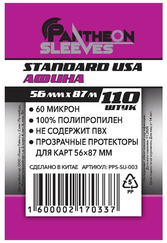 Протекторы Pantheon Sleeves изготовлены из тонкого прозрачного полипропилена 60 микрон. Они обеспечат удобную игру, и защитят карты от пыли, жировых отложений пальцев, заломов и пр.