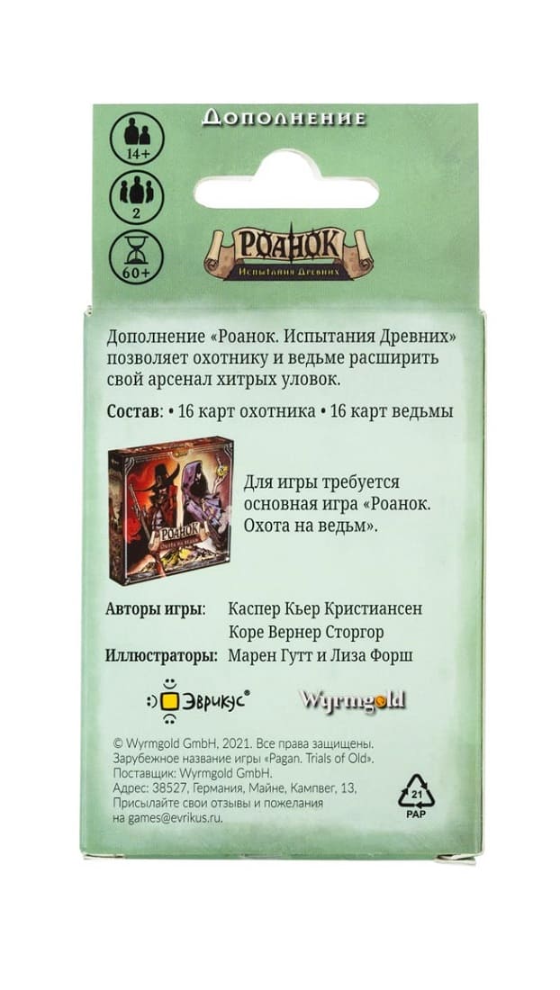 Дополнение «Роанок. Испытание древних» содержит карты для ведьмы и охотника с новыми приемами и уловками для Охотника и Ведьмы, они позволят попробовать новые стратегии и тактики и подарят новый игровой опыт.