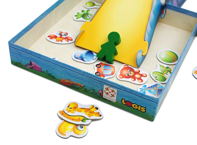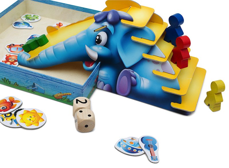 У этой настолки очень необычное для ходилки игровое поле, на котором нет ячейки «финиш». Поле выглядит как детская горка в виде синего слоника, которая установлена в песочнице. Ячейками поля являются ступеньки, по которым игроки взбираются наверх. Главной же особенностью игры является адаптивность ее правил под различный возраст и уровень подготовки игроков. В ней предусмотрено 2 вида адаптируемых правил под игроков 2-4 и 5 лет.