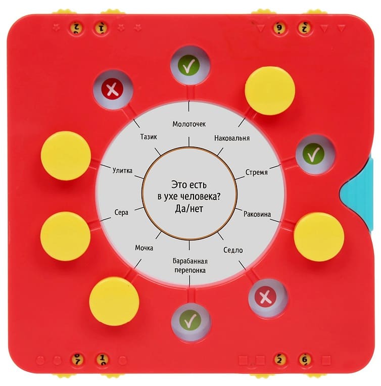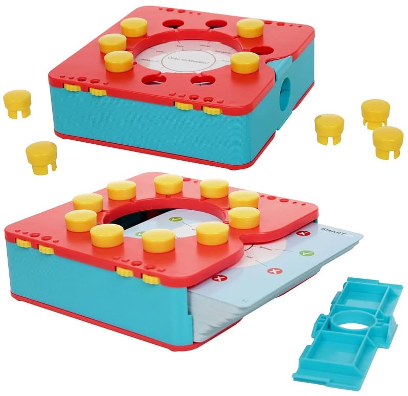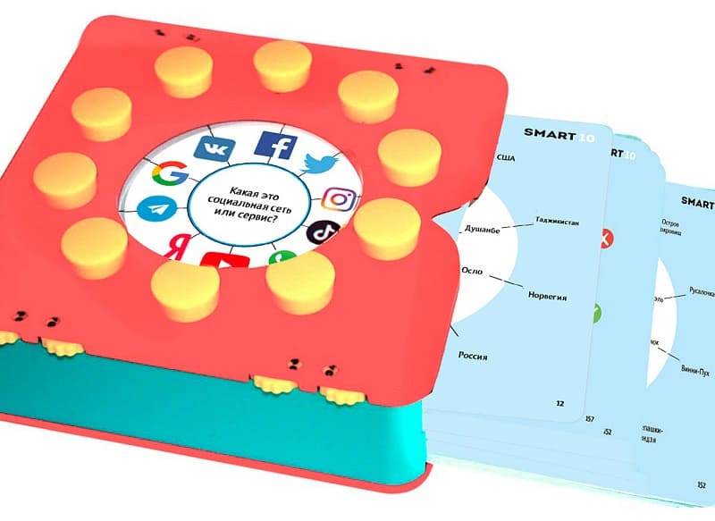 Перед началом партии в смарт-бокс помещаются карточки с вопросами. Помимо вопроса, который написан в самом центре карты, вокруг него указаны 10 вариантов ответов, а вот подтвердить правильным является ответ или нет игроки могут только если откроют специальную желтую фишку-крышку на смарт-боксе напротив выбранного ответа.