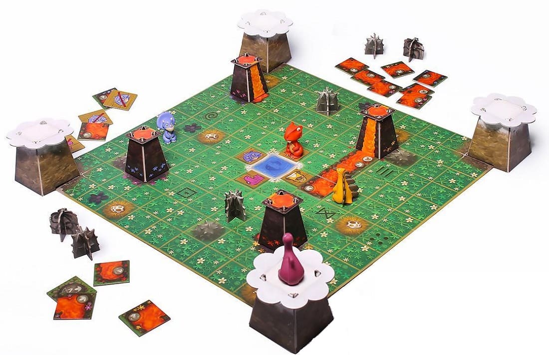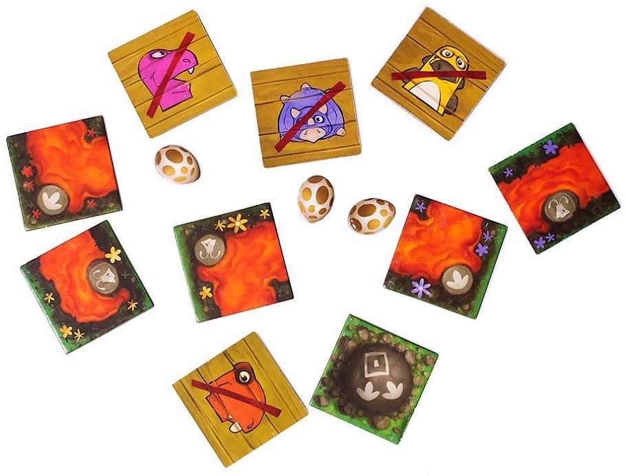 Задача игроков – спасти динозавров и их яйца от потоков лавы, для чего необходимо провести их по полю к горам, на которых они могут укрыться от стихии. На каждой горе может спастись только 1 динозавр.