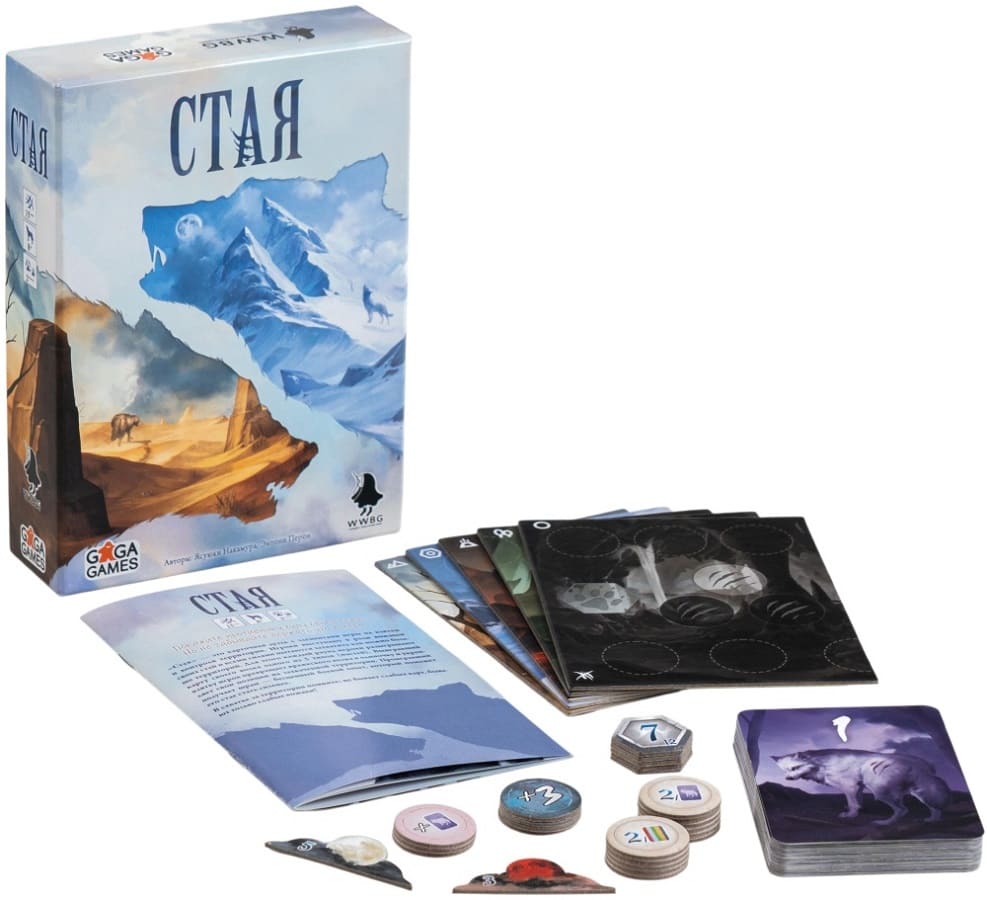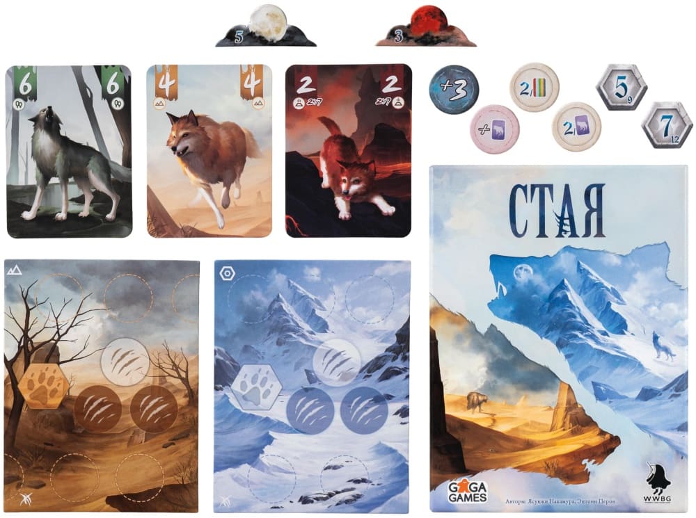 Партия игры «Стая» состоит из 13 раундов, полных взлетов и падений для каждой стороны. Разыгрывая карты волков пяти разных мастей, игроки делают ставки за определенные локации. Доминирование на них приносит победные очки, а поражение – бесценный опыт. Мудрость вожака – залог победы, только она позволит работать сообща взрослых волков и маленьких волчат.