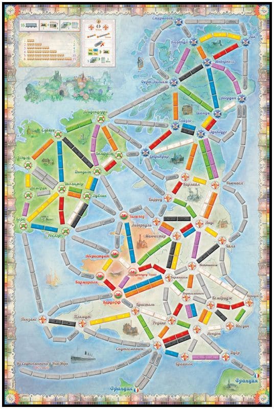 На железных дорогах Великобритании и Ирландии в начале партии Вам будут доступны лишь короткие перегоны в пределах Лондона и окрестностей. Но прогресс не стоит на месте! Изучайте новые технологии – от пропеллеров до паровых турбин, – и вы сможете строить паромы, проходить по два перегона за ход и достигнете самых дальних уголков Соединённого Королевства, вплоть до острова Скай.