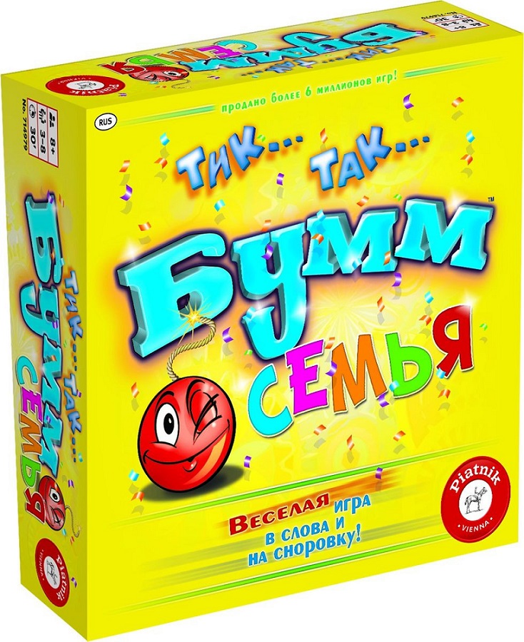 Семья одна из последних версий игры Тик Так Бумм, предназначенных для семейного развлечения с детьми в возрасте от 8 лет. Участников ждут увлекательные задания по которым нужно будет сочинять слова на определенные темы, подбирать рифму на скорость, угадывать ассоциации, собирать пазл и многое другое.