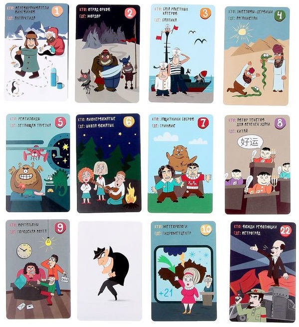 В коробке 2 парные колоды карт на которых изображены забавные профессии. Одна колода с картами-заданиями для ведущего, вторая – ориентиры для отгадок.