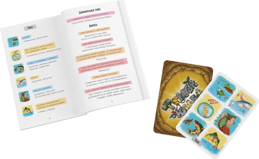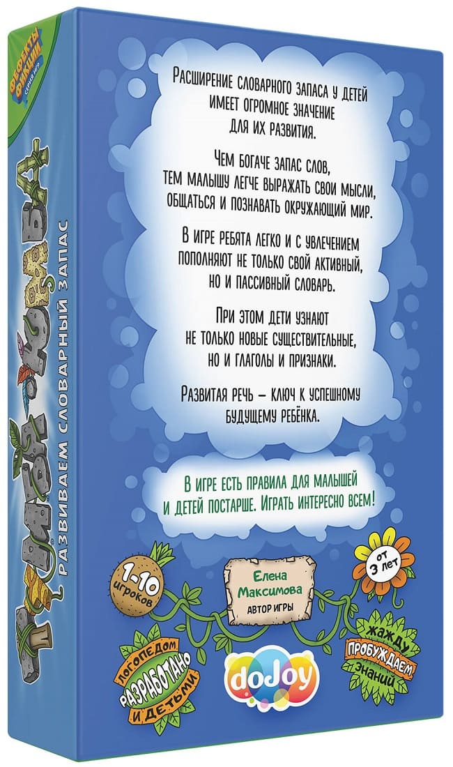 Игра разделена на две группы малышей: до 4 -х лет и старше, поэтому будет адаптивна под разный уровень развития ребенка. Основной игровой компонент – карты: с сине зеленой рубашкой касаются существительных, а с коричневой – глаголам и признакам. Помимо этого, ребенок познакомиться с интересными фактами, а также популярными фразеологизмами. Прилагаемый к игре буклет с правилами содержит подсказки для родителей чтобы игра была наиболее полезной и интересной.