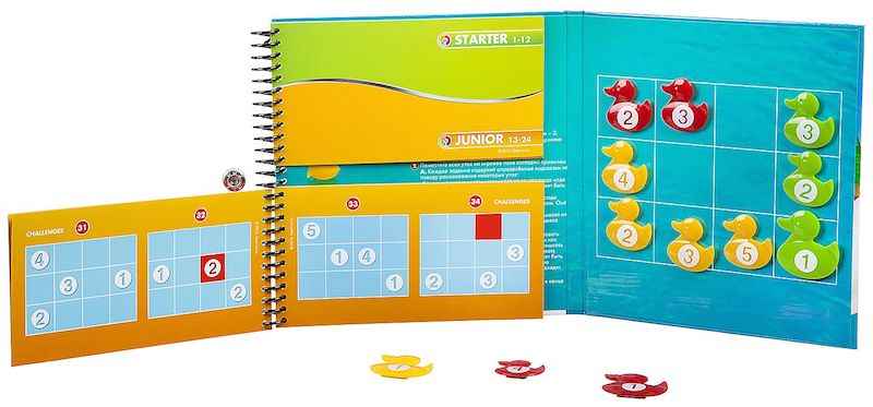 Утки всегда ходят по порядку. Вот и здесь игрокам предстоит выстроить на поле 3 на 4 клетки все три утиных семьи так, чтобы каждая из них образовывалась непрерывная цепь. Мамы должны всегда стоять впереди колонны, а дети, строго следуя порядку своего номера. На одной клетке поля не могут стоять 2 утенка.