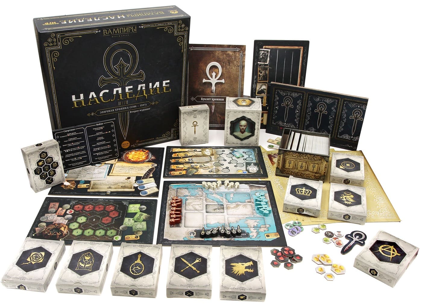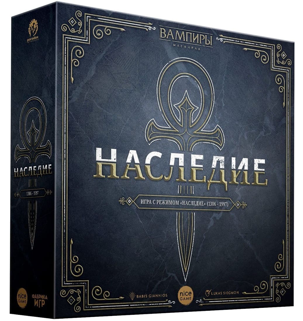«Вампиры: Маскарад – Наследие» - настольная игра, погружающая участников в альтернативную реальность – Мир тьмы, в котором на протяжении тысячелетия происходят битвы между различными кланами вампиров. В игре реализована механика «наследия», которая учитывает ранее полученные результаты и влияет на финал игр. На этой странице представлено второе издание игры, которое было изменено авторами на основании отзывов игроков, и содержит обновленный буклет правил.