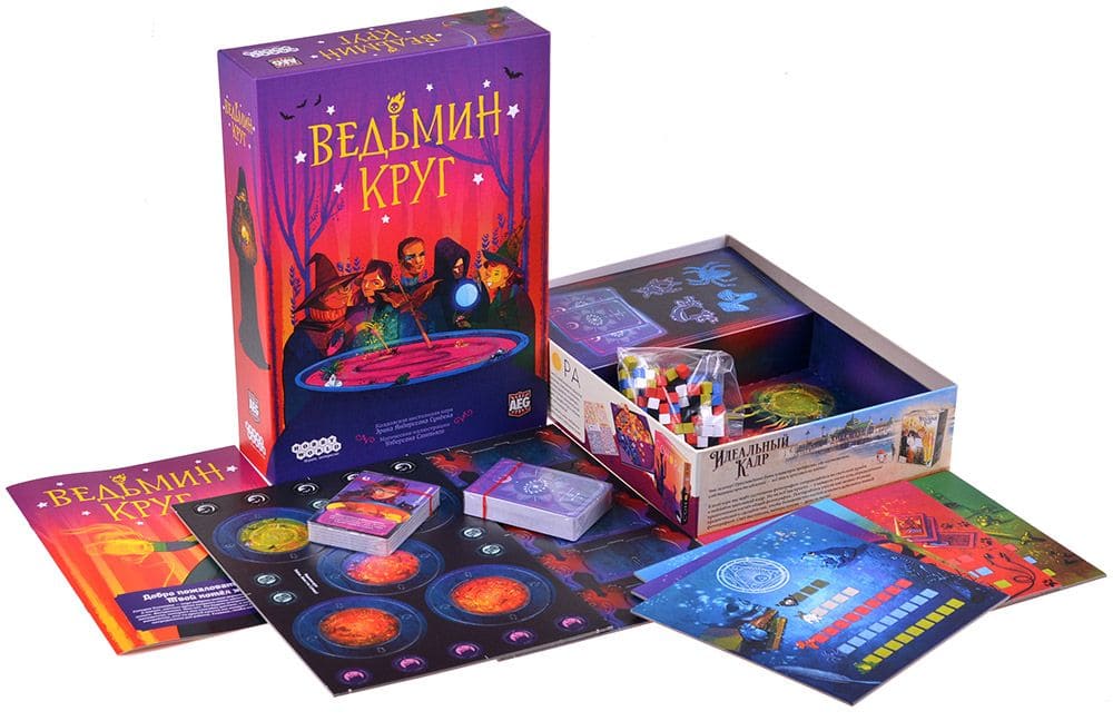 «Ведьмин круг» — это карточная настольная игра, в которой игрокам предстоит готовить зелья таким образом, чтобы у оппонента справа было слишком много ингредиентов и за это получать победные очки. Рассчитана она на компанию от 2 до 5 человек возрастом старше 13 лет.